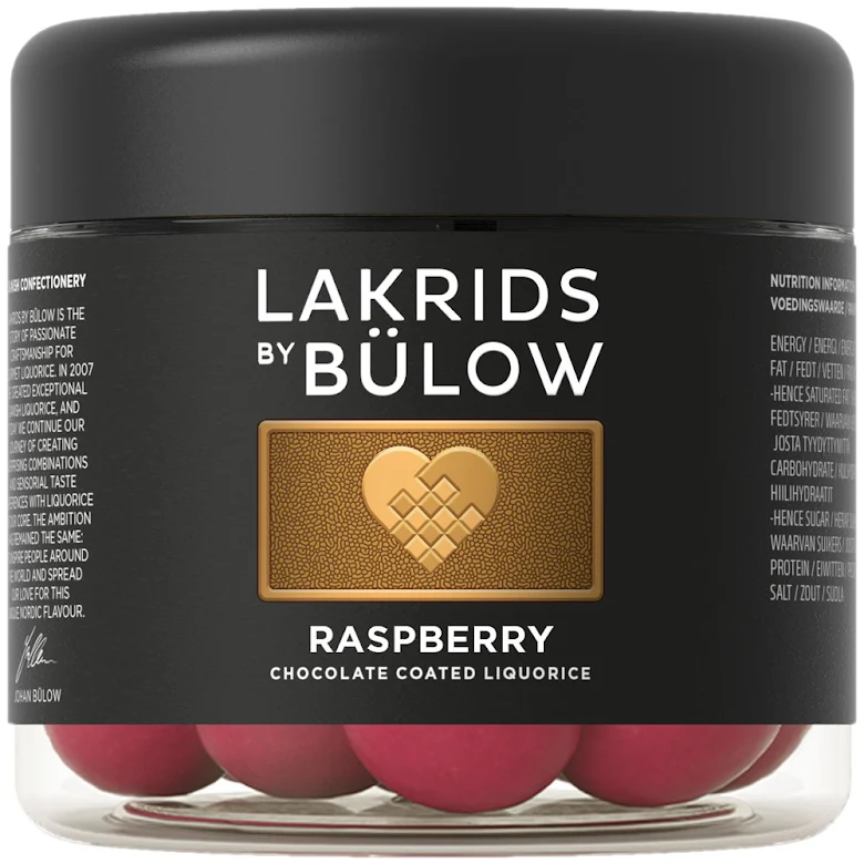 Crispy Raspberry: Sötlakrits omgiven av sötman hos vit choklad med färska rosa hallon och en aning jordgubb som förstärker de röda tonerna. Bit i en kärna av söt lakrits spunnen i vit choklad och med fruktiga toner från små flingor av hallon. Allt omgivet av ett tunt rosa sockerskal.